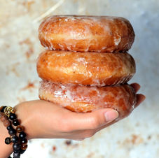 Our original glaze doughnut with house made garlic aioli sauce, pickles, a vegan chick'un patty by Veggie Paradise, and a crisp lettuce.